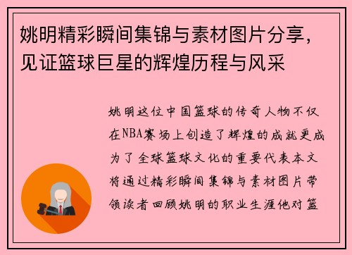 姚明,这位中国篮球的传奇人物,一直以来都是中国篮球的象征。他的重返赛场不仅能够为中国篮球注入新活力,更能给年轻球员带来希望与激励。通过回顾姚明的辉煌经历,我们可以发现,他对中国篮球的发展起到了至关重要的作用。文章将从四个方面详细阐述姚明重返赛场所带来的影响,包括他的个人魅力、对青少年球员的激励、提升国际影响力以及推动国内篮球的发展。每一个方面都将具体探讨姚明如何在不同层面上为中国篮球注入新的生机和...