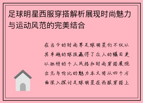 在现代社交网络盛行的时代,个人头像不仅仅是一个简单的标识,更是展示个性和魅力的重要窗口。特别是对于男生来说,一个有吸引力的头像能够有效提升自我形象,从而在各种场合中赢得更多关注和好感。其中,足球明星因其独特的魅力和影响力,成为众多男生头像的热门选择。本文将从四个方面详细探讨如何通过足球明星的形象来塑造男生个性魅力,包括足球明星的形象价值、如何选择合适的头像、借鉴明星风格的方法,以及个性化表达的重要...